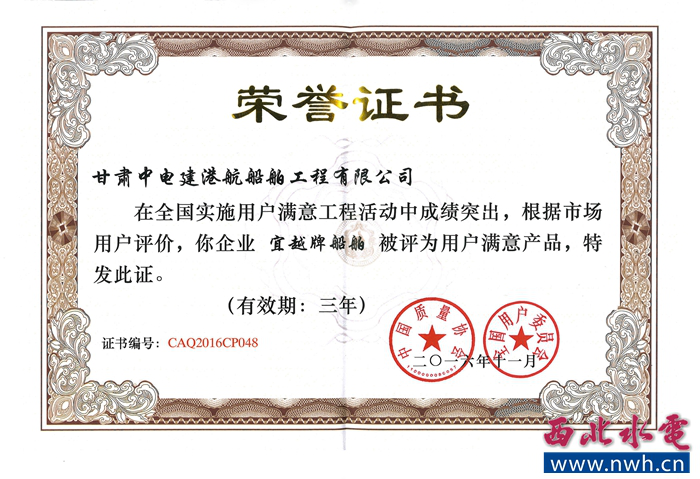 全国用户满意工程是由中国质量协会发起并联合国家有关部门、行业协会于1996年开始共同推进的一项社会性质量活动。2016年,为贯彻落实《质量发展纲要(2011—2020年)》《中国制造2025》文件精神、引导广大企业进一步树立“以用户为中心”的经营理念,中国质量协会和全国用户委员会继续开展了“实施用户满意工程”推进活动。本次评选活动自2016年8月开始,逐层上报,经永靖县临夏州、甘肃省质监局、中国质量协会分别调研,以及第三方用户满意度测评、推荐单位推荐和专家评审,于2016年10月,中国质量协会下达文件,西北院港航船舶公司成功通过初审。11月24日,港航船舶公司“宜越牌船舶”被评为用户满意产品,在2016年全国实施用户满意工程推进大会受到表彰。