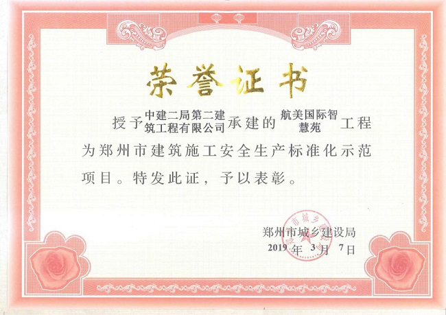 郑州航美国际智慧苑项目,通过中建二局二公司科学管理、精心施工,工程项目被郑州市城乡建设局评为郑州市建筑施工安全生产标准化示范项目。