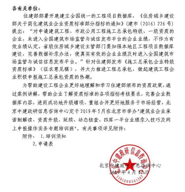 关于举办建筑业企业承诺制解读、资质升级、延续、动态核查、四库一平台业绩录入技巧及网上申报操作实务专题培训班的通知